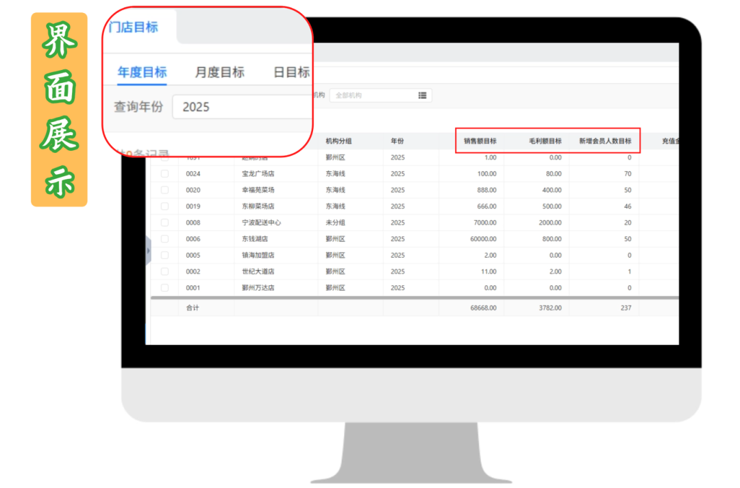 👉目标管理:可按年、月、日维度设置门店目标,全方位覆盖销售额、毛利额、新增会员人数、充值金额、客单量目标等等。业绩落地更高效。同时,老板还可以通过云掌柜随时查看目标进度,完成率自动刷新,门店问题早发现、早止损。